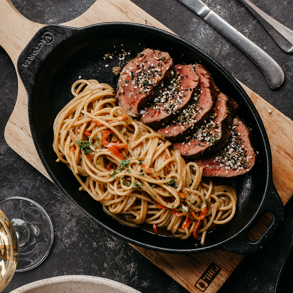 LOMO BANGKOK CENTRO DE LOMO FINO ACOMPAÑADO CON SPAGHETTI EN SALSA ASIÁTICA DE SOYA, JENGIBRE Y AJONJOLÍ